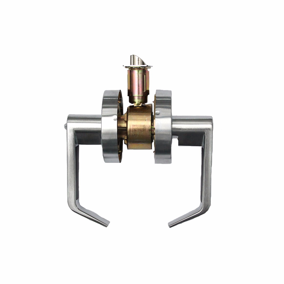 按下內(nèi)轉(zhuǎn)鈕,鎖舌/外執(zhí)手鎖住,鎖舌被鎖住時,門外通過鑰匙開鎖,門內(nèi)通過執(zhí)手開鎖,門內(nèi)執(zhí)手常開。